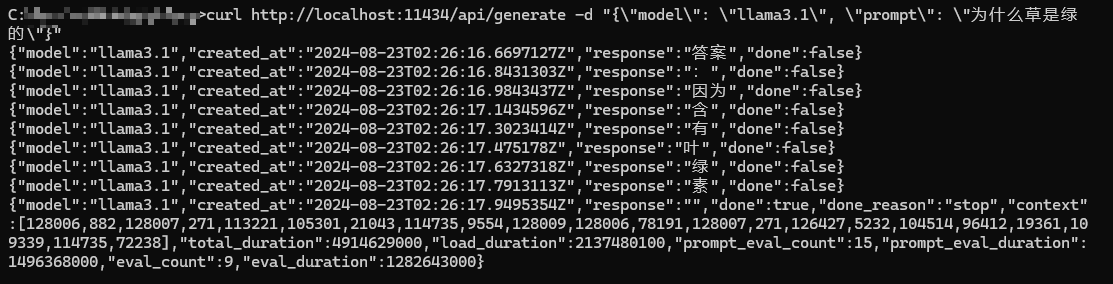 curl http://localhost:11434/api/generate -d "{\"model\": \"llama3.1\", \"prompt\": \"为什么草是绿的\"}"
