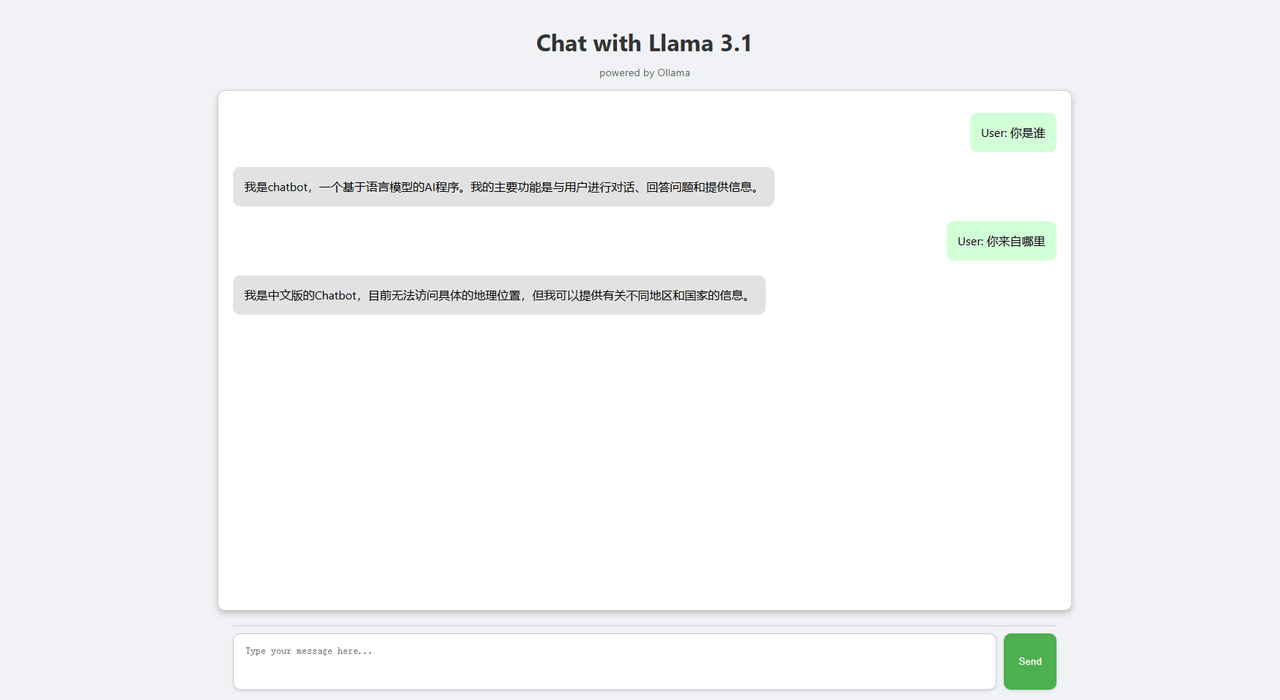• stream = ollama.chat(...):调用 ollama 库中的 chat 方法,指定使用的模型为 llama3.1。将用户的输入作为消息传递给模型,并启用流式传输(stream=True),以便逐步获取模型生成的回复。