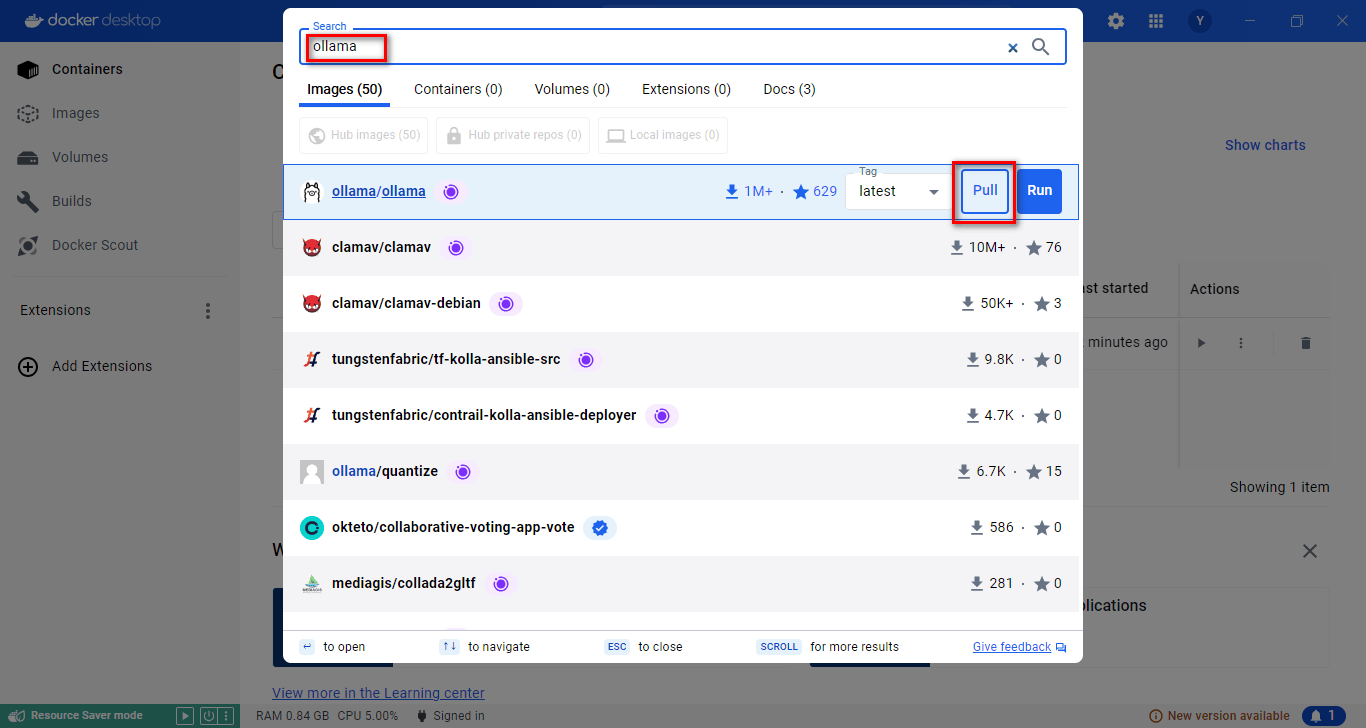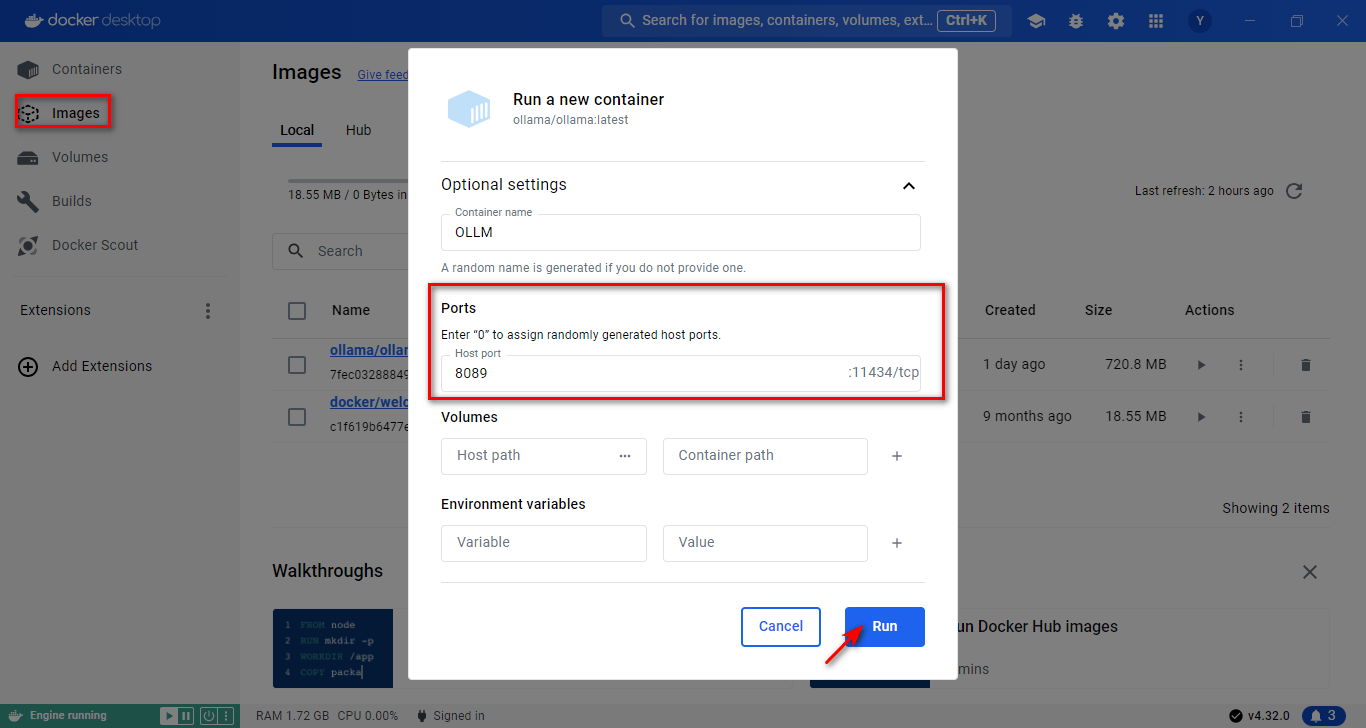 ../../image中找到Ollama镜像,点击run标识即可运行,注意运行前在弹出的可选设置里面,选定一个端口号(如8089)。