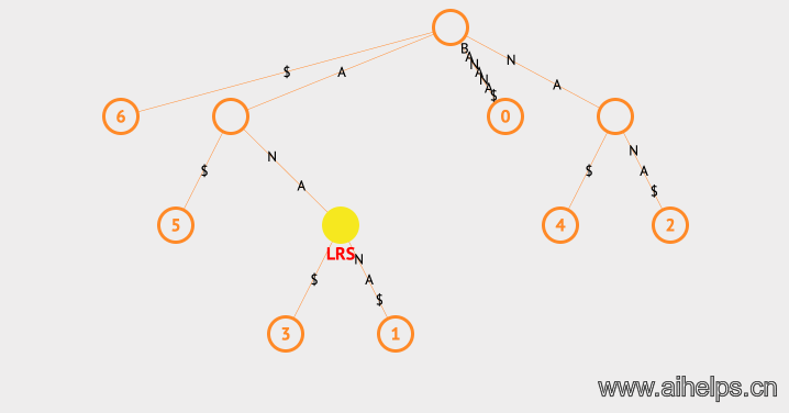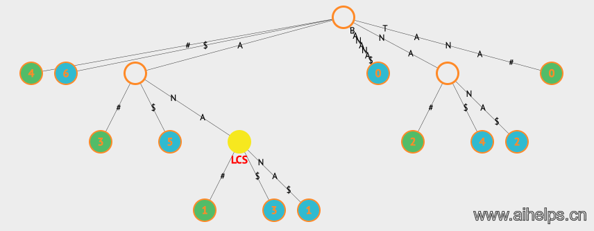 上面的例子中,LCS表示的是Longest Common Substring,我们同时用两种不同的颜色表示该节点属于哪一个字符串。