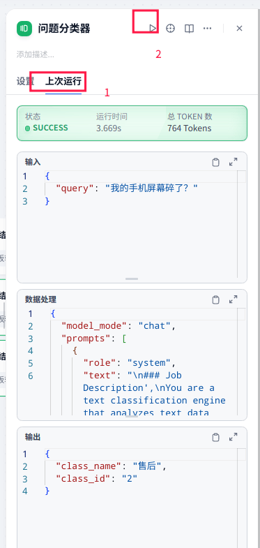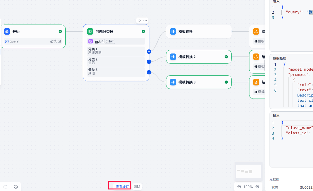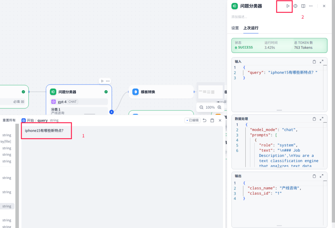 比如我在变量缓存把query修改成:iphone15有哪些新特点?然后点击问题分类节点的执行按钮,会发现query变成了"iphone15有哪些新特点?"